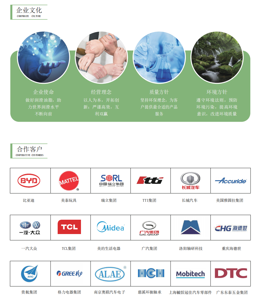 公司擁有現代化的廠房、領先行業的生產設備、國際一流的潤滑實驗室及先進齊備的臺架實驗設備 ; 工廠位于廣東省中山市民眾鎮,廠區占地面積 60 畝 ; 公司質量 & 環境管理體系縝密完善,研發實力強大,擁有多名行業專家和一批經驗豐富的潤滑脂技術骨干,并與中山大學、華南理工大學及杭州軸承研究所等高校和科研機構建立了合作伙伴關系,科研實力雄厚。