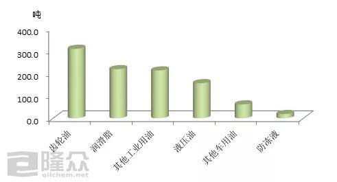 4月齒輪油訂單量308.6噸、潤滑脂訂單量218.1噸、其他工業(yè)潤滑油212.6噸、液壓油155.9噸、其他車用潤滑油61.6噸、防凍液18.8噸。